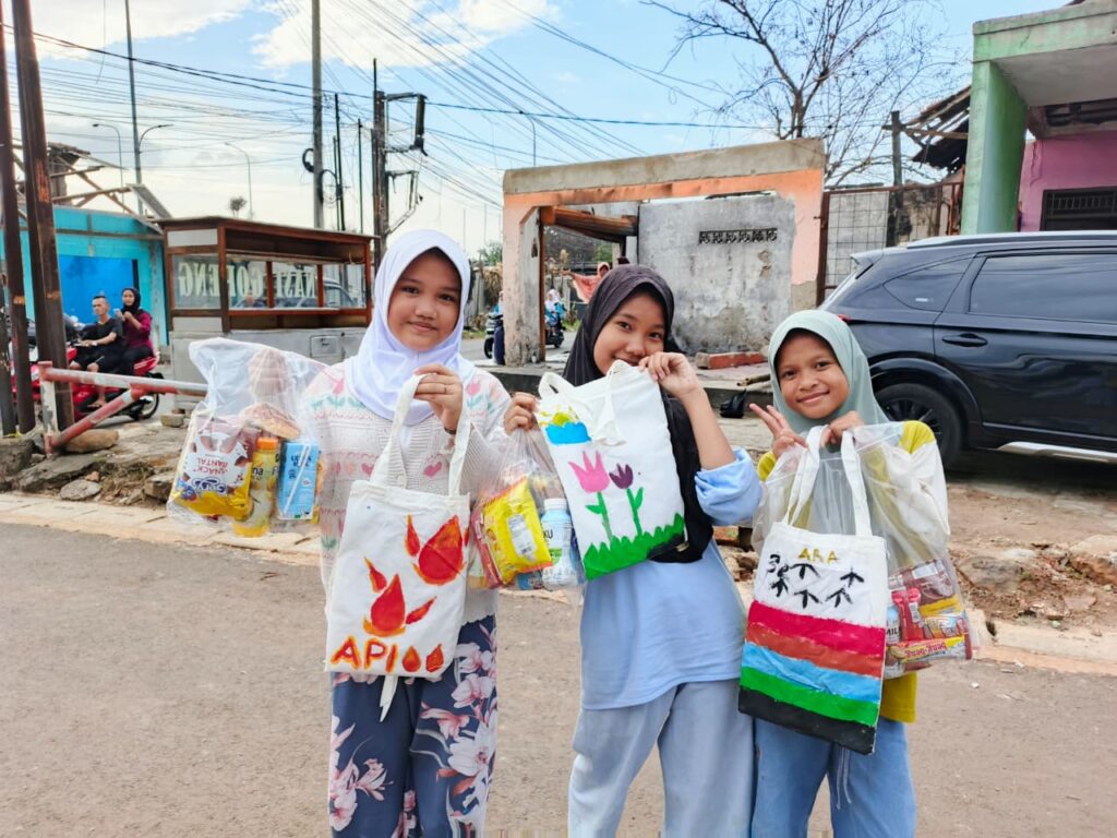 Keseruan terpancar saat Kak Muthia memandu sesi kreatif melukis tas blacu. Warna-warni cat air seolah menyiratkan senyum ceria anak-anak yang sejenak melupakan trauma pasca bencana kebakaran.