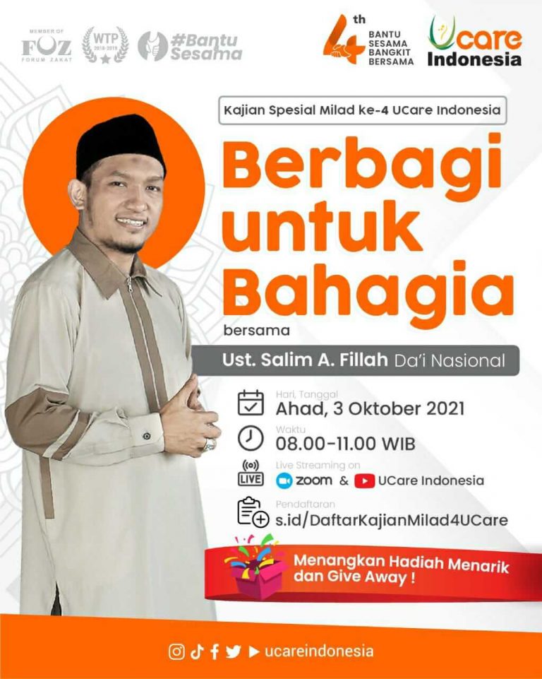 Dalam rangka merayakan milad UCare Indonesia ke 4 tahun yang jatuh pada hari Ahad, 3 Oktober 2021. Insya Allah UCare Indonesia akan mengadakan kegiatan Kajian Online dengan tema “Berbagi untuk Berbahagia” yang akan disampaikan oleh Ustadz Salim A. Fillah melalui Zoom yang juga akan disiarkan secara live di akun Youtube LAZ UCare Indonesia.